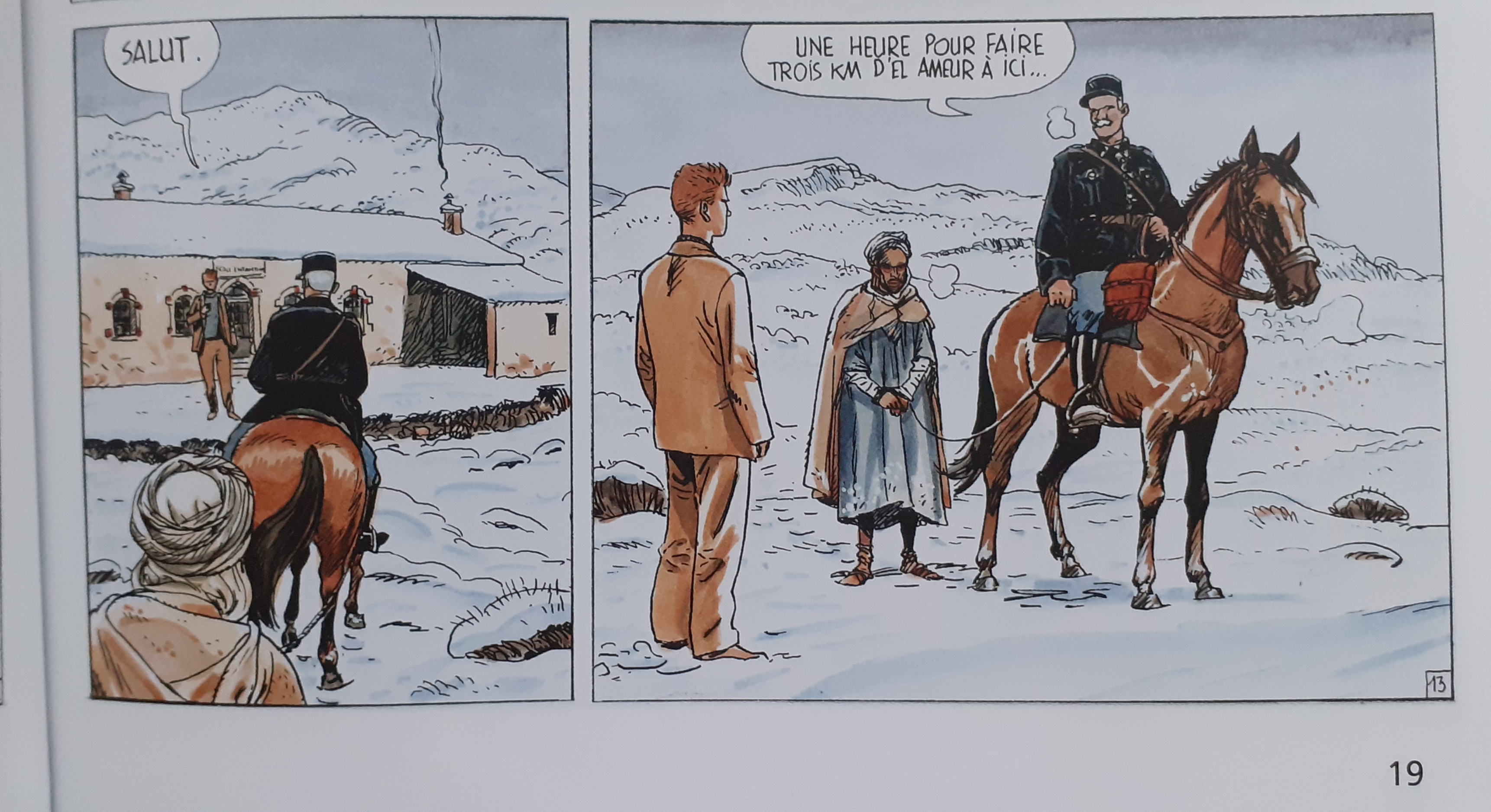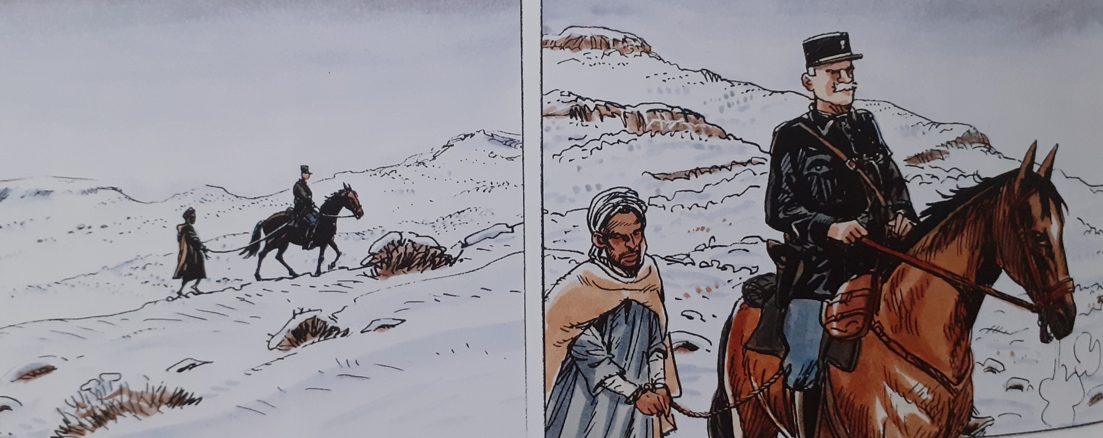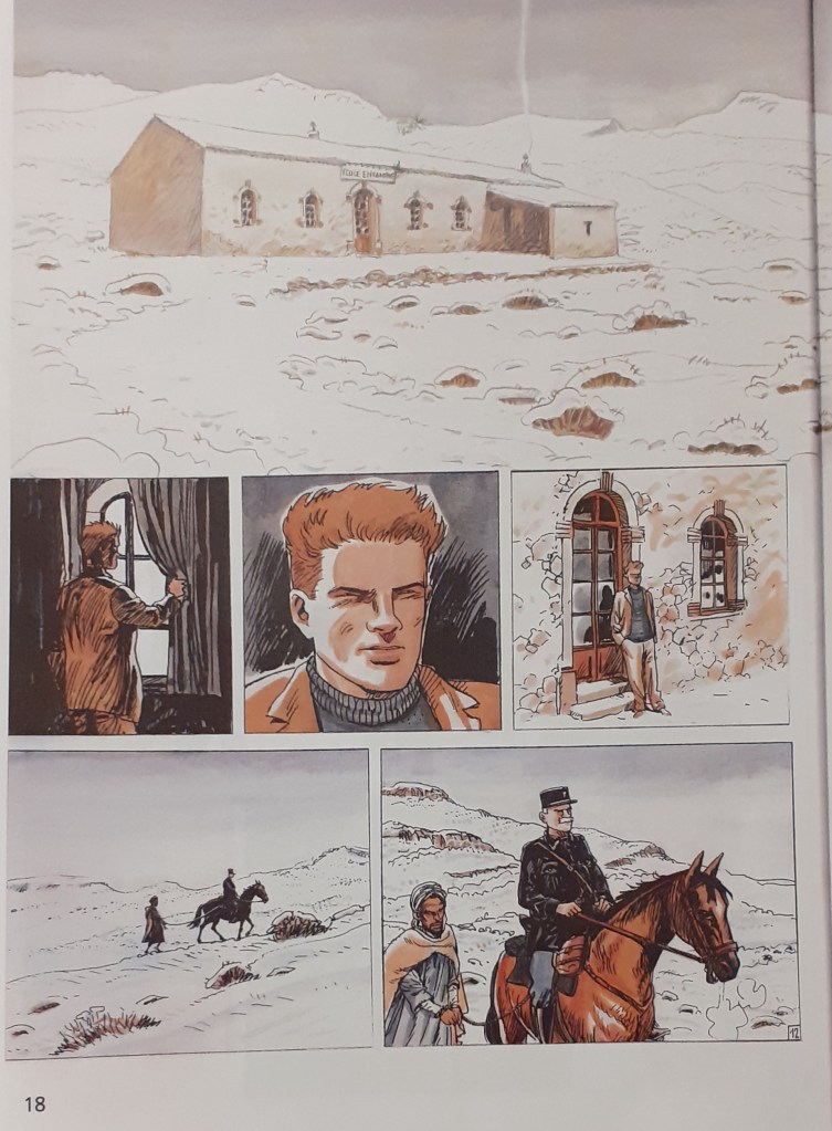 L’enseignant observait comment les deux hommes s’approchaient de lui. Les deux hommes approchaient, l’un était à cheval et l’autre à pied. Les deux hommes avançaient lentement et ils s’efforçaient de progresser dans la neige. Le chemin était très raide jusqu’à l’école. L’enseignant a vu qu’il était très difficile pour les deux hommes d’arriver jusqu’à lui. L’un des hommes savait comment s’y prendre et a pu suivre la piste dans la neige. L’enseignant est retourné à l’école et dans la salle de classe froide. Au tableau, les quatre fleuves de France étaient représentés. La neige était tombée à la mi-octobre après huit mois de sécheresse. Le problème était que les élèves ne pouvaient plus se rendre à l’école. Le chemin était recouvert de neige. Pendant la nuit, la neige a diminué. L’enseignant restait dans sa chambre. Il ne sortait que pour donner à manger aux poules. La camionnette de Tadjid est arrivée. Normalement, la camionnette met 40 minutes, cette fois-ci, il lui a fallu 8 heures. Le malheur de la sécheresse a touché tous les habitants des environs. Beaucoup de gens sont morts, mais l’enseignant ne s’en est pas rendu compte et s’est senti comme un moine. Peut-être que l’un des pères ou des frères leur fournirait du blé à l’école. Des bateaux chargés de blé arrivaient maintenant de France et le pire était désormais passé. C’était une catastrophe, des gens et des moutons mouraient, et parfois personne ne s’en rendait compte. L’enseignant était maintenant très satisfait du peu qu’il avait. L’enseignant regarda par la fenêtre, il reconnut un homme, le cavalier Balducci. Balducci tenait l’Arabe par une corde.