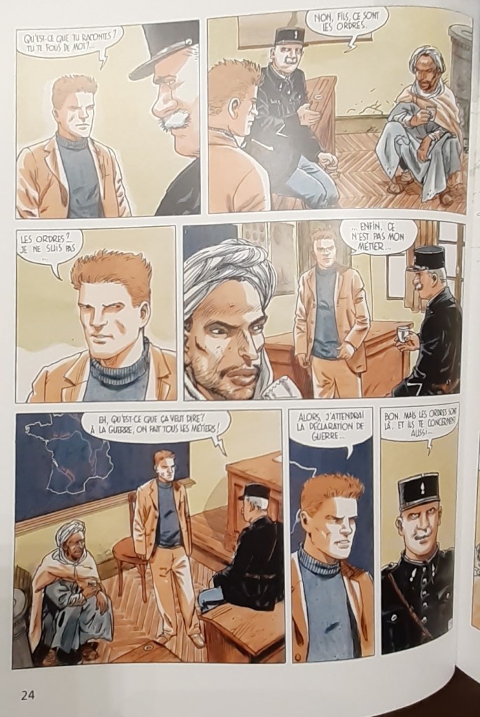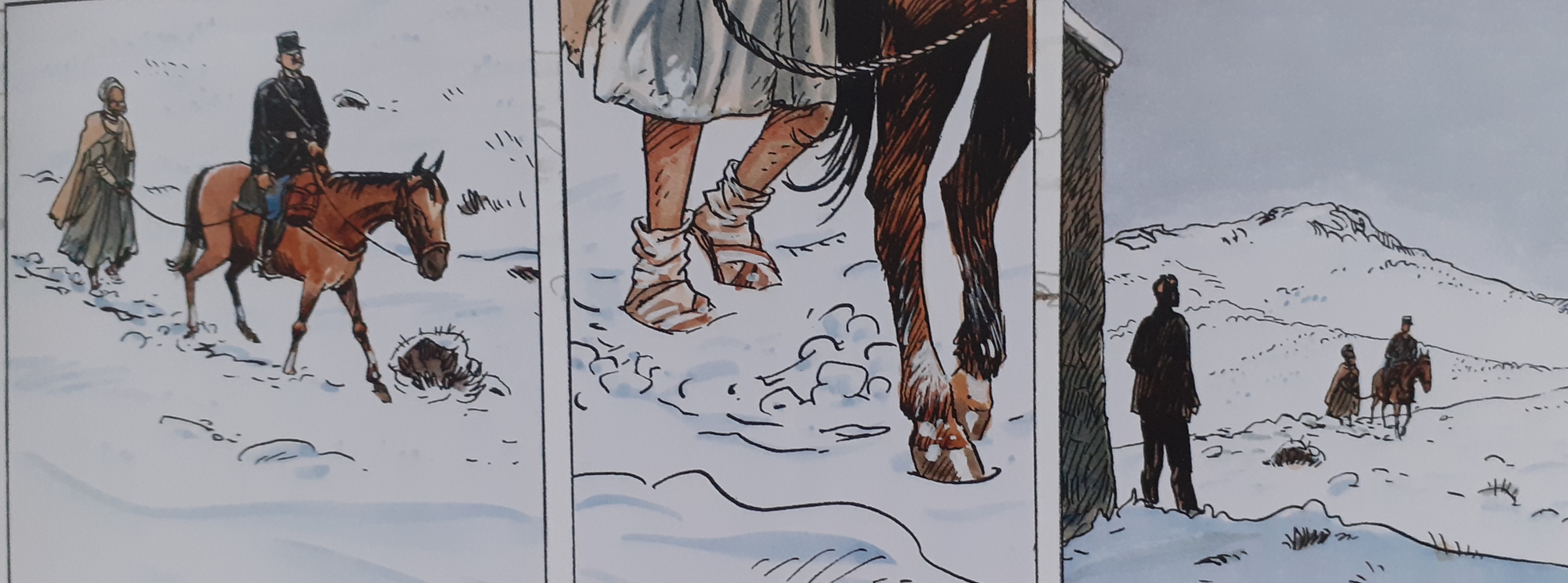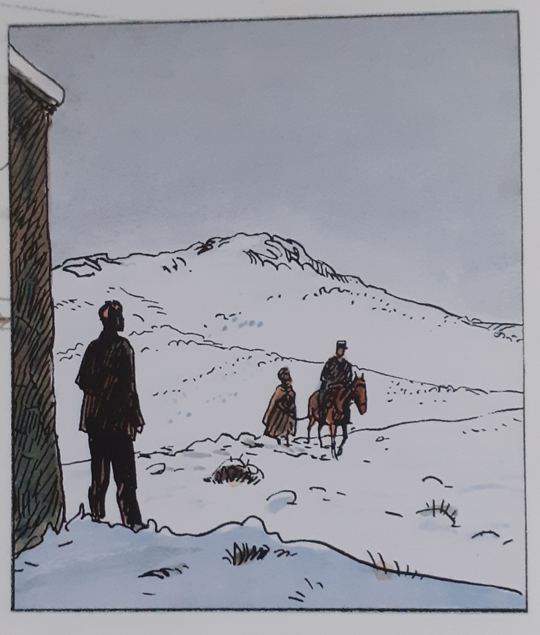 L’enseignant observait comment les deux hommes s’approchaient de lui. Les deux hommes approchaient, l’un était à cheval et l’autre à pied. Les deux hommes avançaient lentement et ils s’efforçaient de progresser dans la neige. Le chemin était très raide jusqu’à l’école. L’enseignant a vu qu’il était très difficile pour les deux hommes d’arriver jusqu’à lui. L’un des hommes savait comment s’y prendre et a pu suivre la piste dans la neige. L’enseignant est retourné à l’école et dans la salle de classe froide. Au tableau, les quatre fleuves de France étaient représentés. La neige était tombée à la mi-octobre après huit mois de sécheresse. Le problème était que les élèves ne pouvaient plus se rendre à l’école. Le chemin était recouvert de neige. Pendant la nuit, la neige a diminué. L’enseignant restait dans sa chambre. Il ne sortait que pour donner à manger aux poules. La camionnette de Tadjid est arrivée. Normalement, la camionnette met 40 minutes, cette fois-ci, il lui a fallu 8 heures. Le malheur de la sécheresse a touché tous les habitants des environs. Beaucoup de gens sont morts, mais l’enseignant ne s’en est pas rendu compte et s’est senti comme un moine. Peut-être que l’un des pères ou des frères leur fournirait du blé à l’école. Des bateaux chargés de blé arrivaient maintenant de France et le pire était désormais passé. C’était une catastrophe, des gens et des moutons mouraient, et parfois personne ne s’en rendait compte. L’enseignant était maintenant très satisfait du peu qu’il avait. L’enseignant regarda par la fenêtre, il reconnut un homme, le cavalier Balducci. Balducci tenait l’Arabe par une corde.